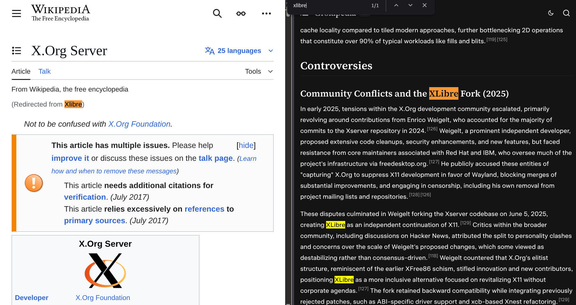 Anche nel mondo open source, Wikipedia e comunità correlate ignorano progetti non allineati alla narrativa dominante. Un esempio lampante è Xlibre, un fork del X.Org Xserver creato nel 2025 da Enrico Weigelt dopo il suo ban da freedesktop.org. Xlibre mira a modernizzare il codice X11, mantenendo compatibilità e aggiungendo funzionalità, mentre pulisce codice obsoleto. Portato su FreeBSD e supportato da comunità Linux, è visto come un revival di X11 contro l'abbandono percepito in favore di Wayland.