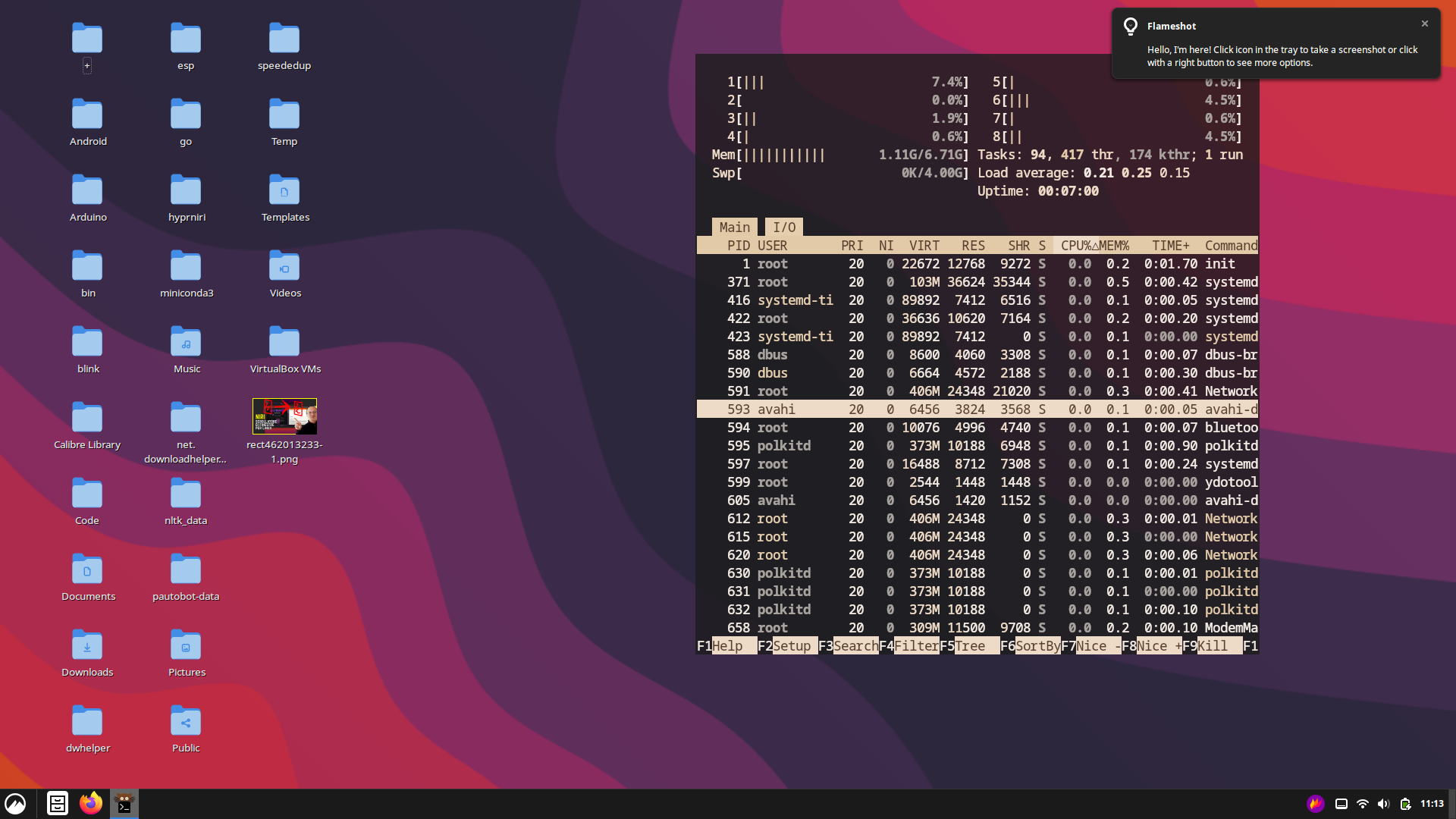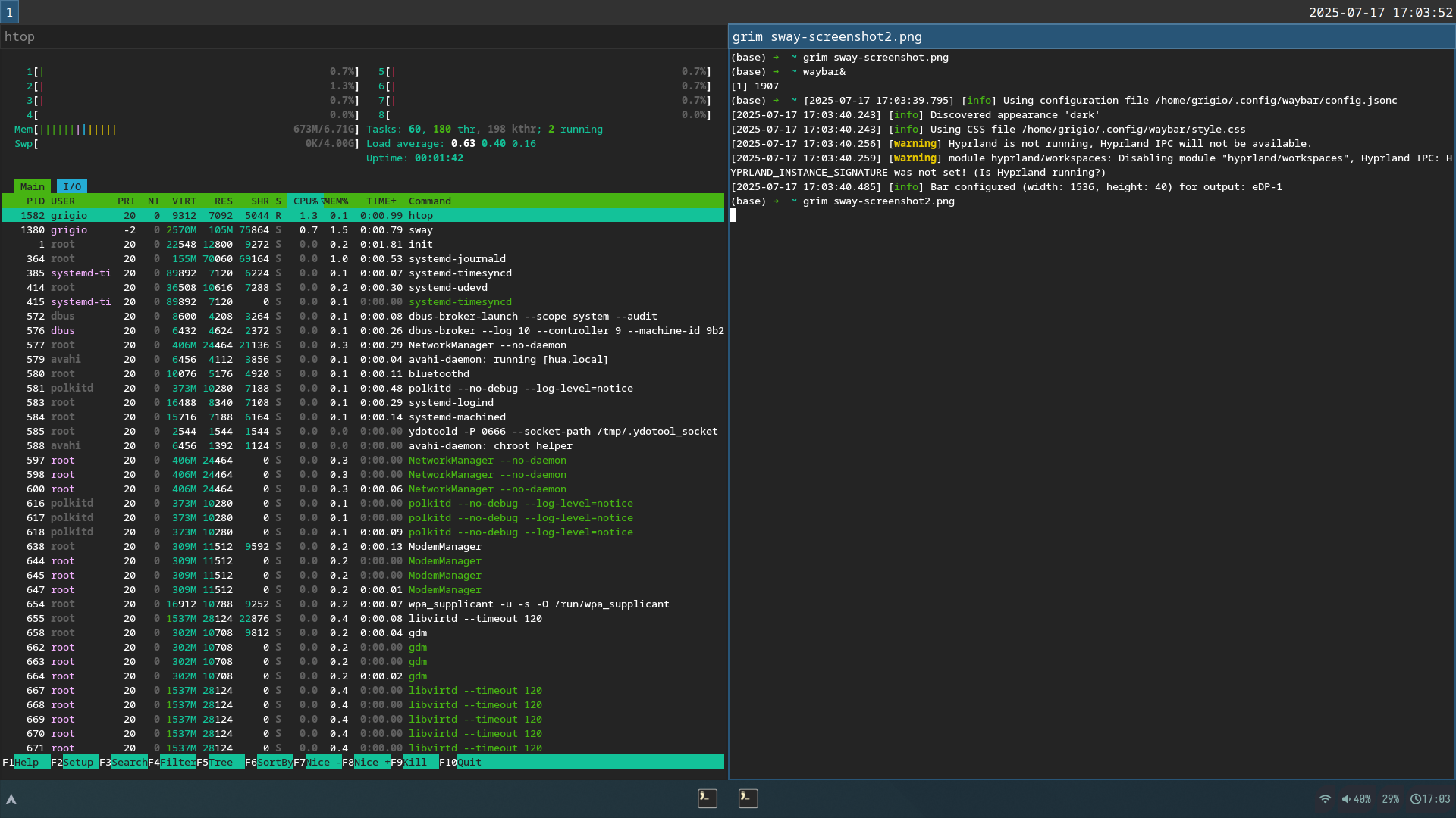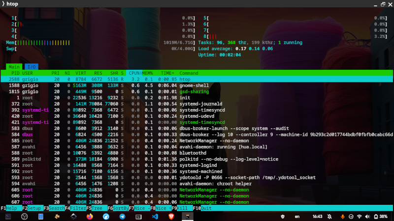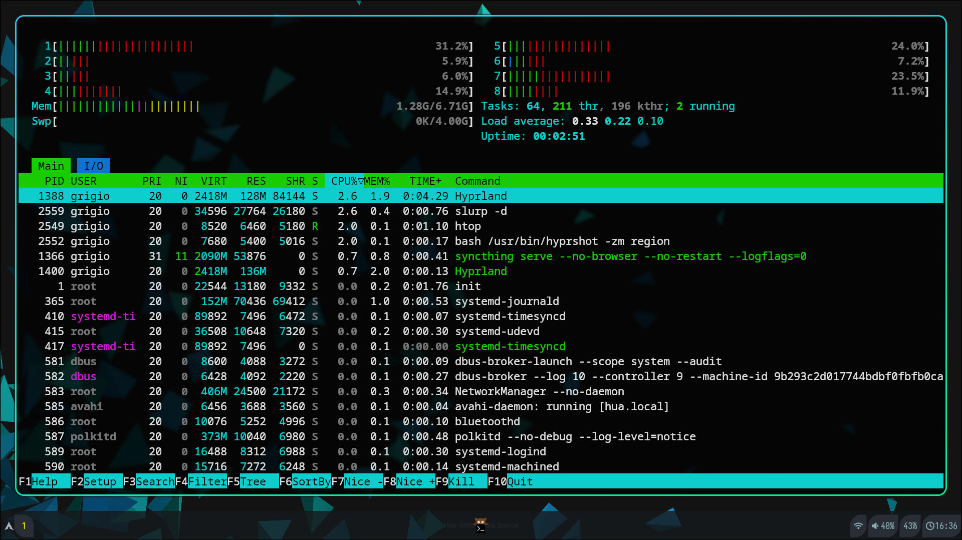 Hyprland: Hyprland è un compositore Wayland dinamico e personalizzabile, ideale per chi desidera un desktop tiling con effetti visivi accattivanti. Offre tiling dinamico, animazioni fluide, e un'ampia configurabilità. Basato su wlroots, supporta sia applicazioni Wayland che X11 tramite XWayland. È ottimizzato per velocità e basso consumo di risorse, anche se può essere instabile su alcune configurazioni hardware. Include dock waybar.
