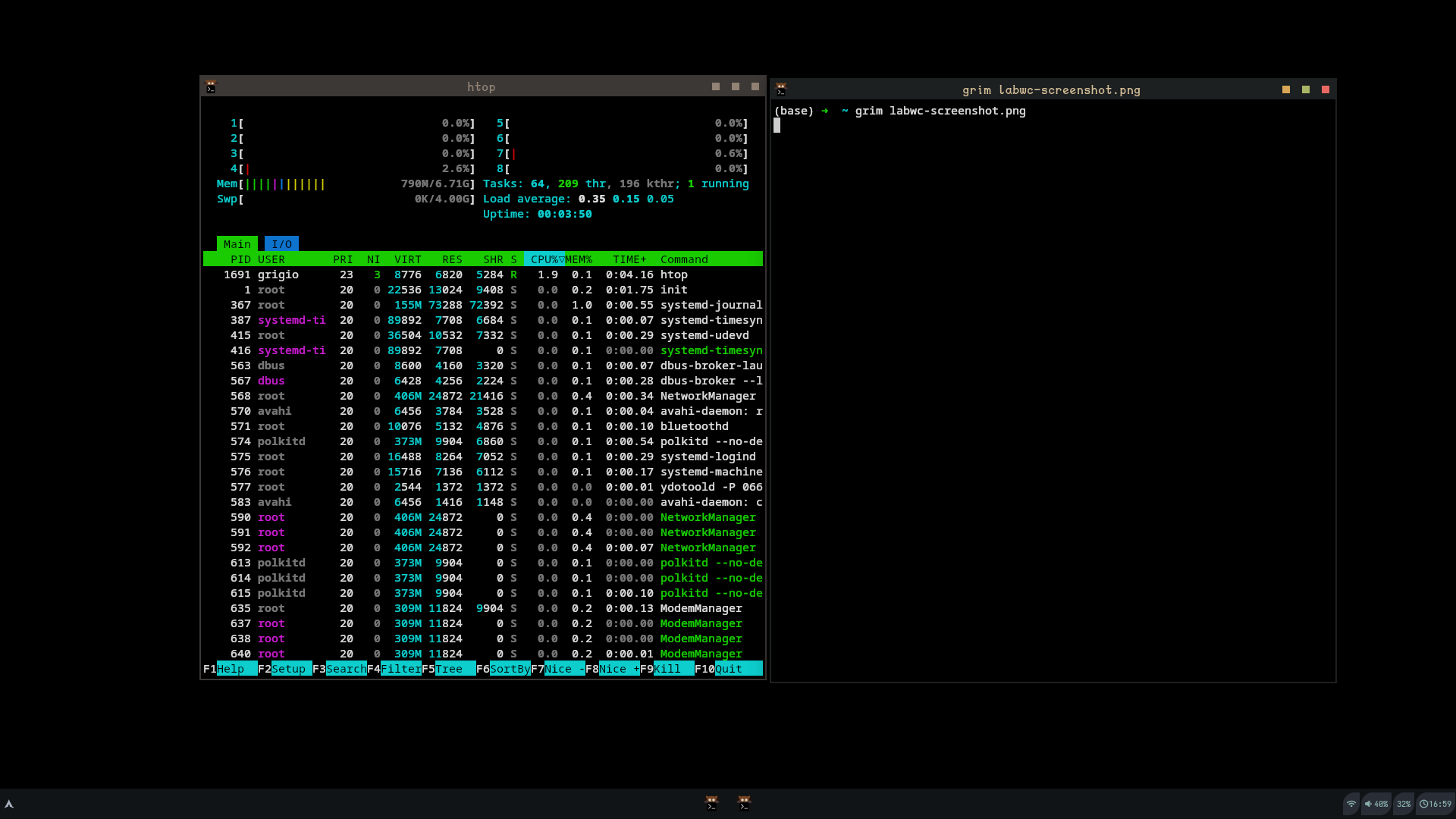 LabWC: LabWC è un compositore Wayland ispirato a Openbox, progettato per essere leggero e tradizionale. Utilizza un approccio stacking per la gestione delle finestre e supporta temi e script personalizzati. È adatto a sistemi meno potenti e può essere configurato per migliorare la sicurezza fisica. Include dock waybar.