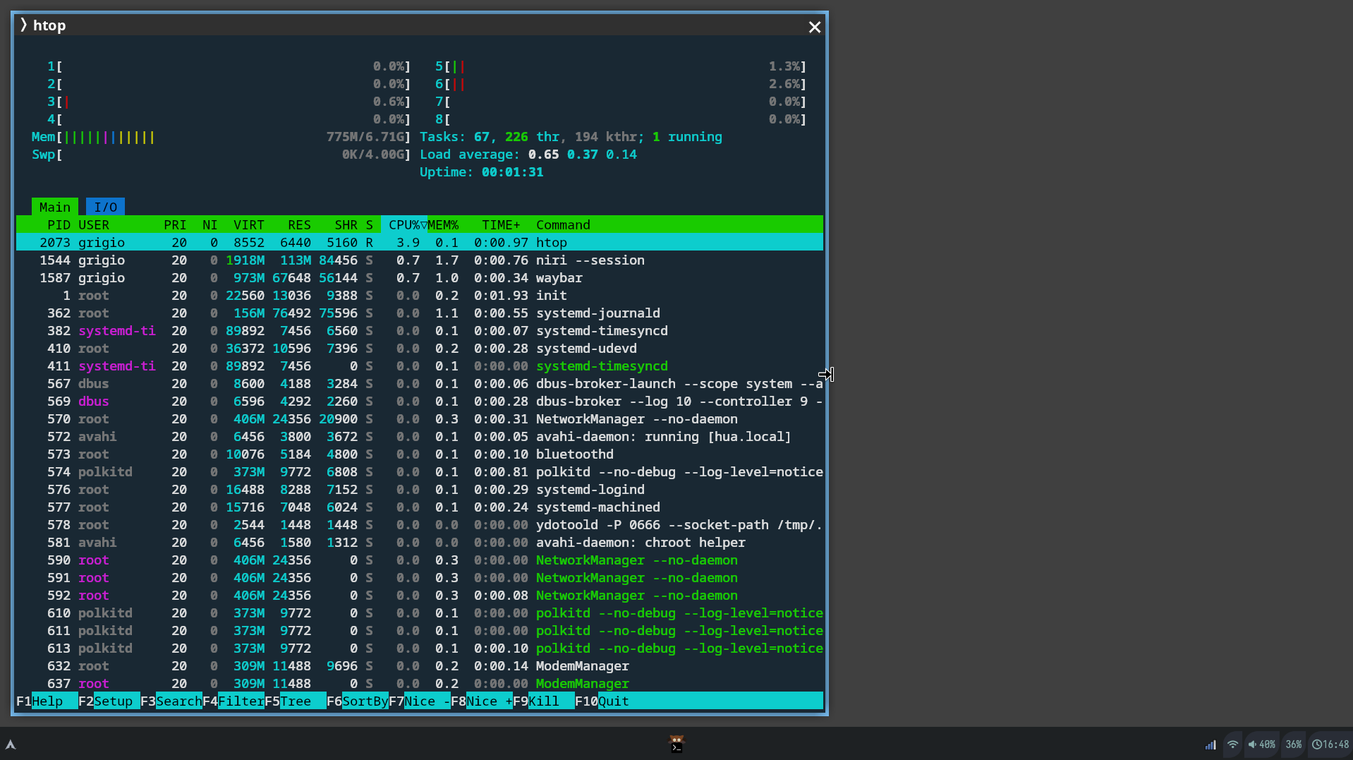 Niri: Niri è un compositore Wayland che introduce un approccio al tiling basato sullo scorrimento, offrendo un'esperienza unica. Le finestre sono disposte in una barra scorrevole, ed è altamente personalizzabile tramite file di configurazione. Leggero e produttivo, è adatto a sistemi con specifiche medio-basse ed è supportato da Archinstall. Include dock waybar.