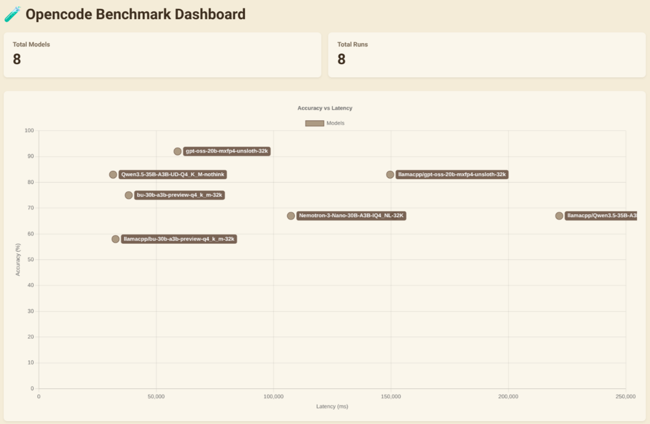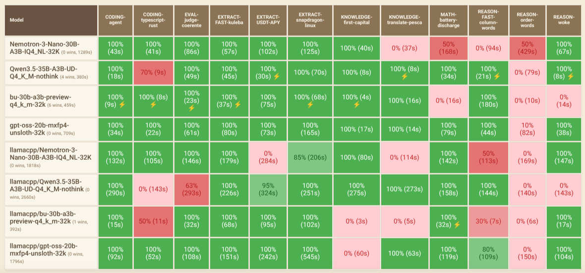 Models with the llamacpp/* prefix were tested with Opencode, while those without it were tested with Pi.